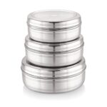 Attro Stainless Steel Puri Dabba with Lid, Food Storage Containers, Big (1100ml), Medium (900 ml), Small (700ml) – Set of 3, Silver, Standard