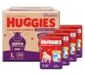 Huggies Complete Comfort Wonder Pants | Pant Style Baby Diapers Large Size, 256 Count | India’s Fastest Absorbing diaper, Clinically Proven to Prevent Diaper Rash | Ideal for 9 to 14 Kgs (64 count, Pack of 4)