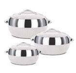 • Complete Set – Color: White; Material: Inner Steel; Outer Plastic; Package Content: 3 – Piece Inner Steel Casserole (450ml, 830ml, 1370ml) for serving a variety of dishes at home, parties, or family gatherings.