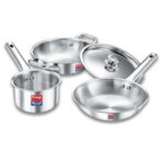 • 𝗩𝗘𝗥𝗦𝗔𝗧𝗜𝗟𝗘 𝟰-𝗣𝗜𝗘𝗖𝗘 𝗖𝗢𝗢𝗞𝗪𝗔𝗥𝗘 𝗦𝗘𝗧: Includes Fry Pan (22 cm / 1.9 L), Kadai (22 cm / 2.5 L) with Stainless Steel Lid, and Sauce Pan (14 cm / 1.3 L) — a complete kitchen combo for sautéing, frying, boiling, and everyday cooking.